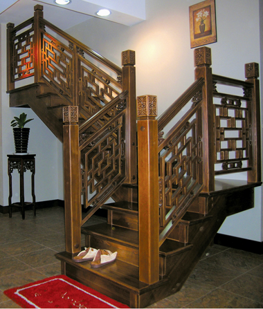 源自名家的经典设计 配以超厚欧洲进口实木 加以纯手工雕刻欧式立柱 美式仿古色装饰和独创炫彩踏板 造就了Amble(安步)楼梯的 超凡气质和个性